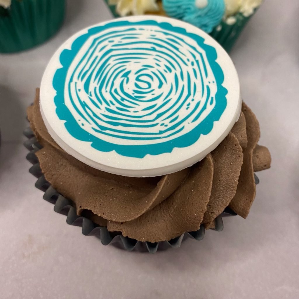Buttercream swirl in one colour with a fondant icing disc topper printed with a logo or one image.